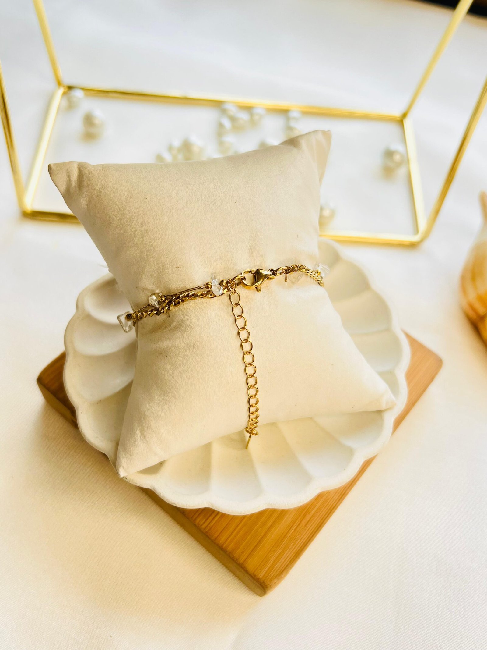 A dainty gold-plated chain bracelet adorned with crystal accents and a vibrant red apple charm — playful elegance with a fruity twist.