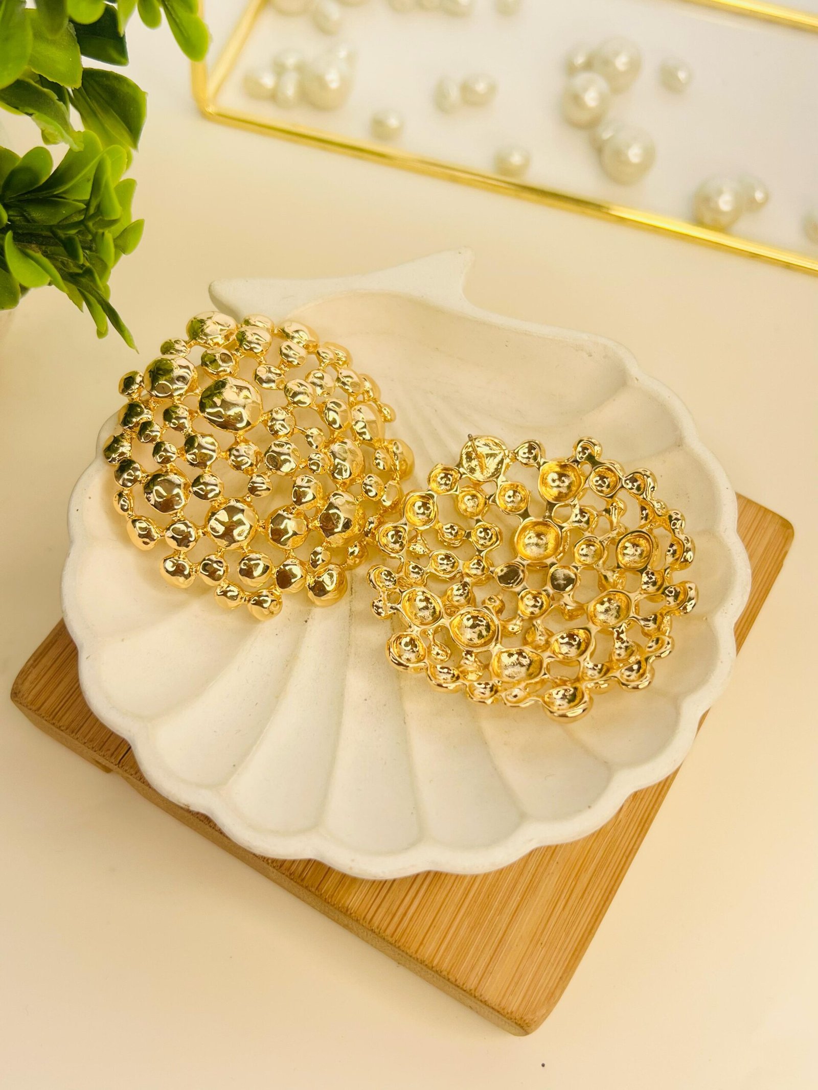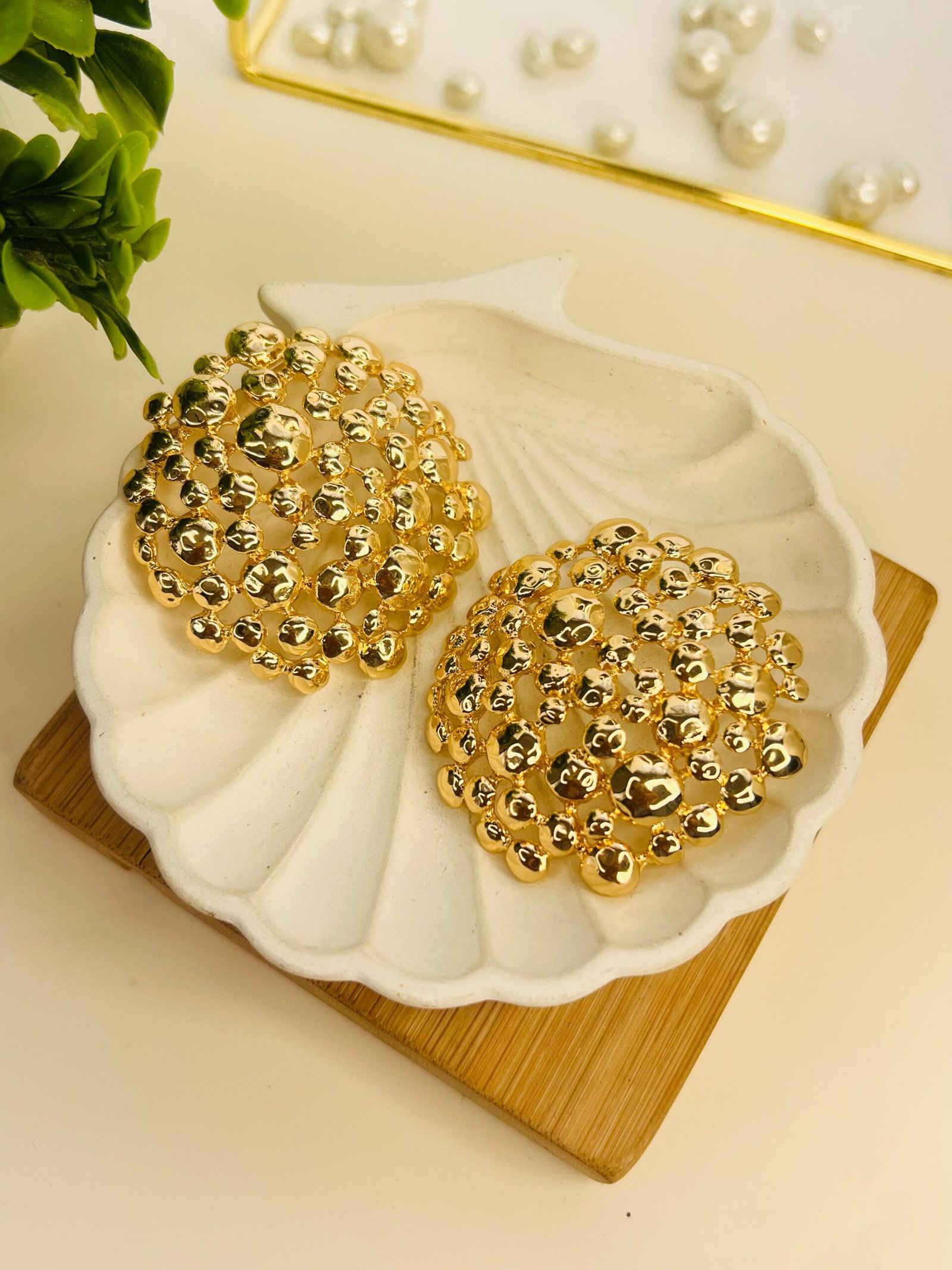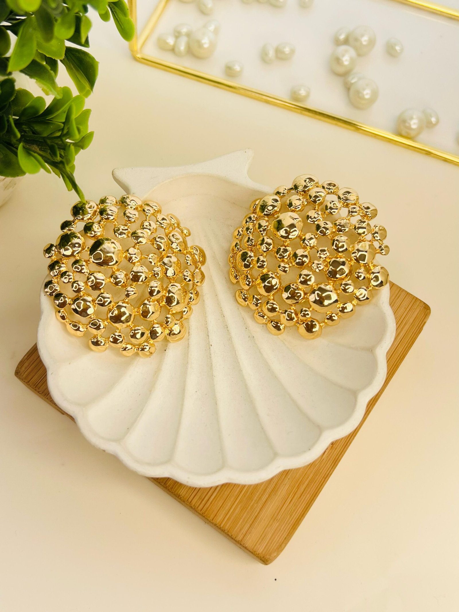 A statement pair of dome-shaped earrings, intricately designed with a cluster of polished gold beads. These studs exude elegance and sophistication, making them perfect for adding a touch of glamour to any look.