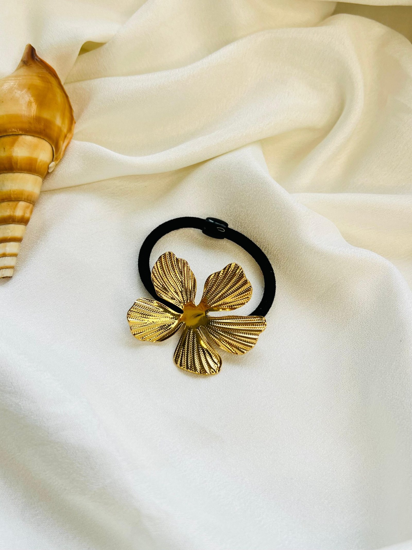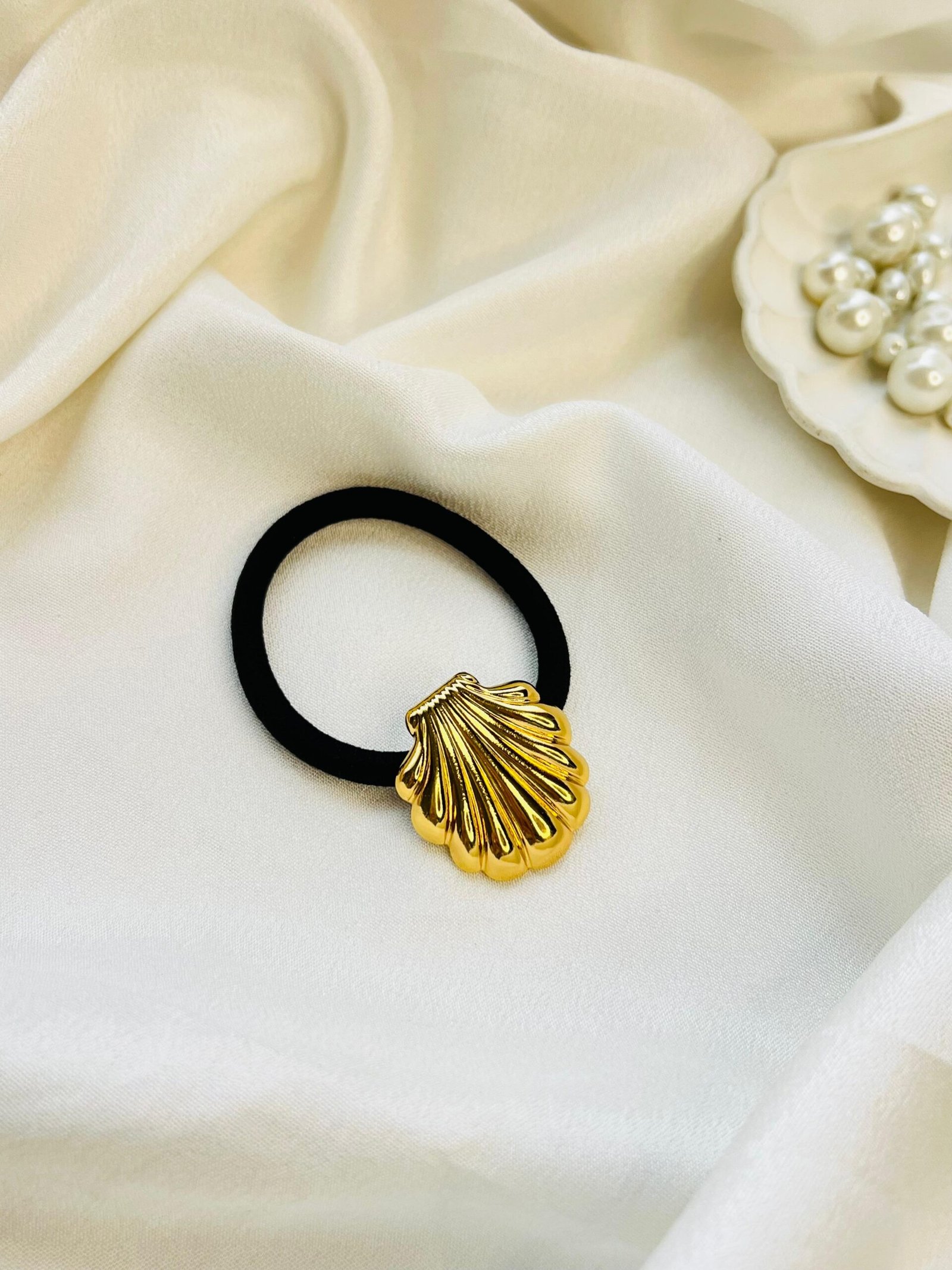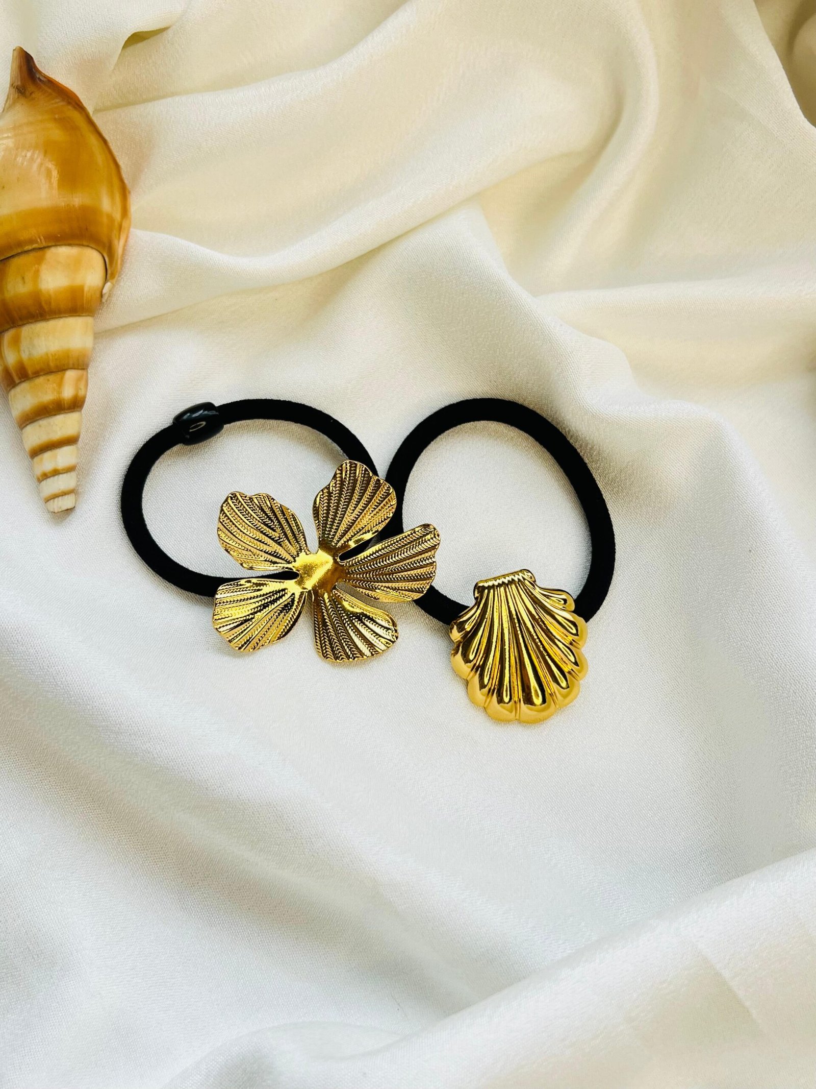 A cute set of hair ties with a golden flower and shell charm— (Pair of 2).
