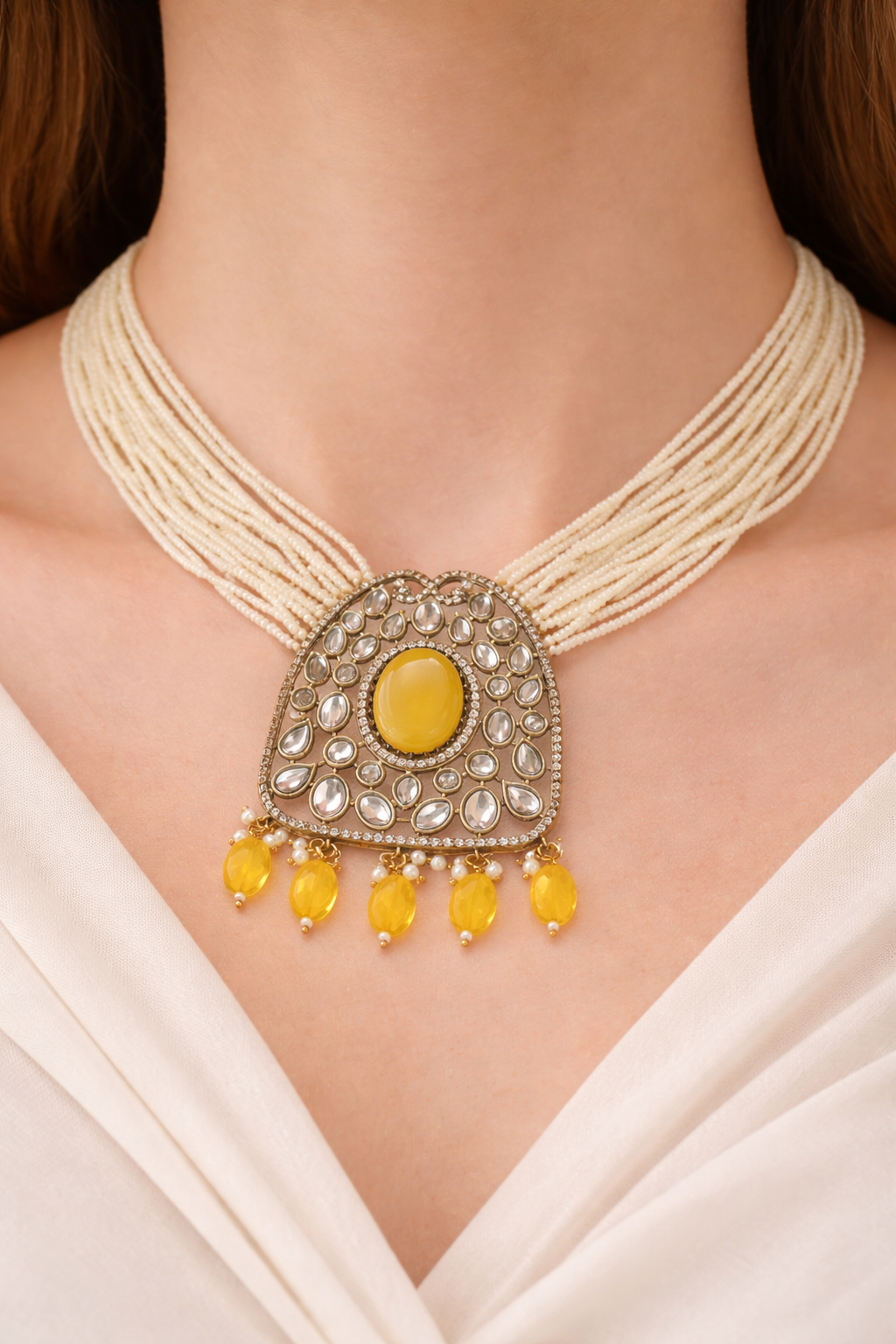 A timeless fusion of tradition and elegance, this set features delicate white beaded layers adorned with a regal statement pendant. The warm amber-hued stones and intricate detailing exude vintage charm, making it a perfect choice for grand occasions and heritage-inspired looks. ✨💛
