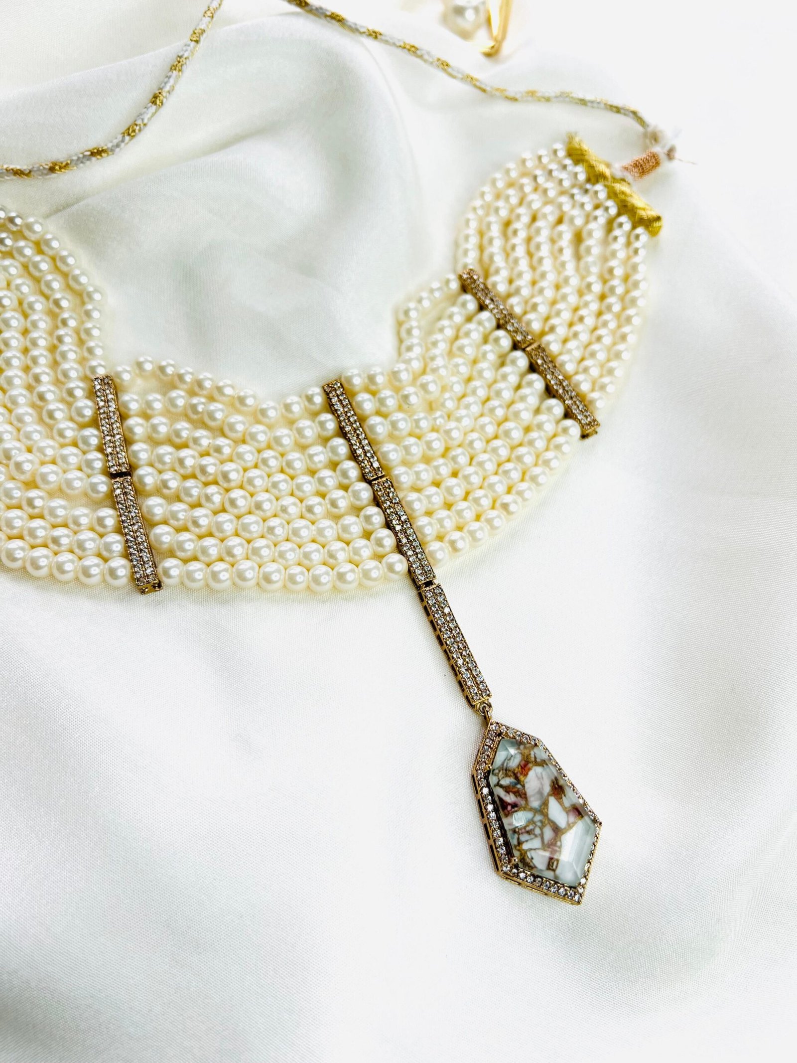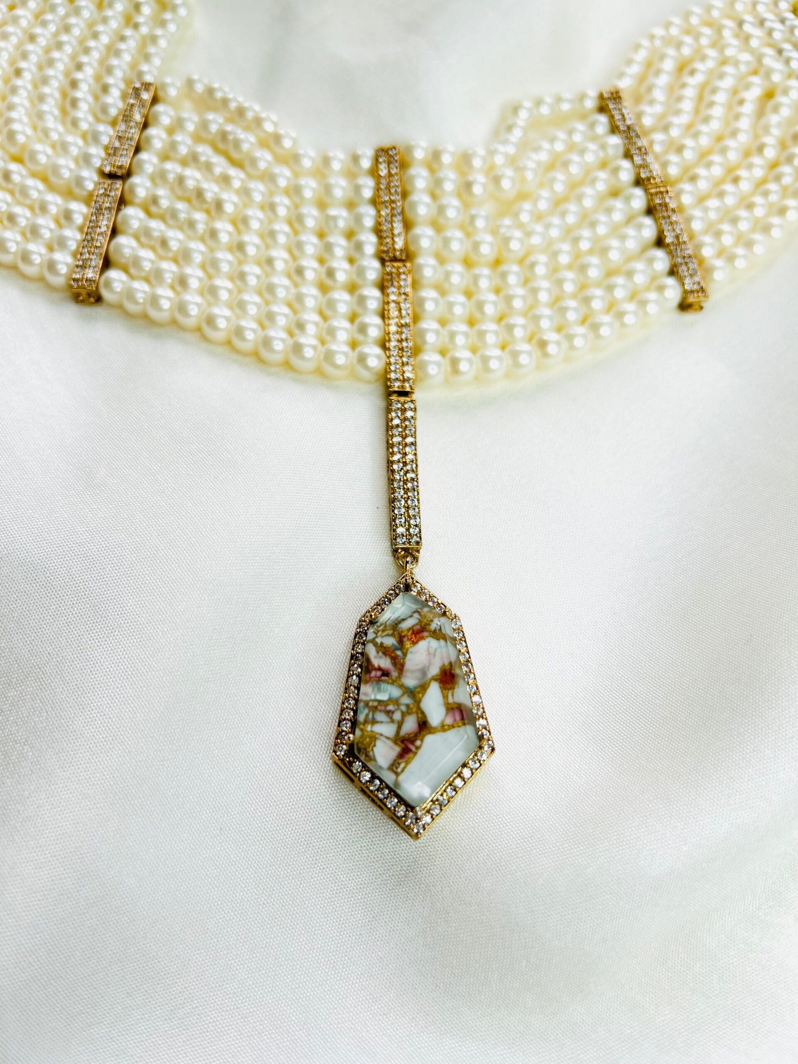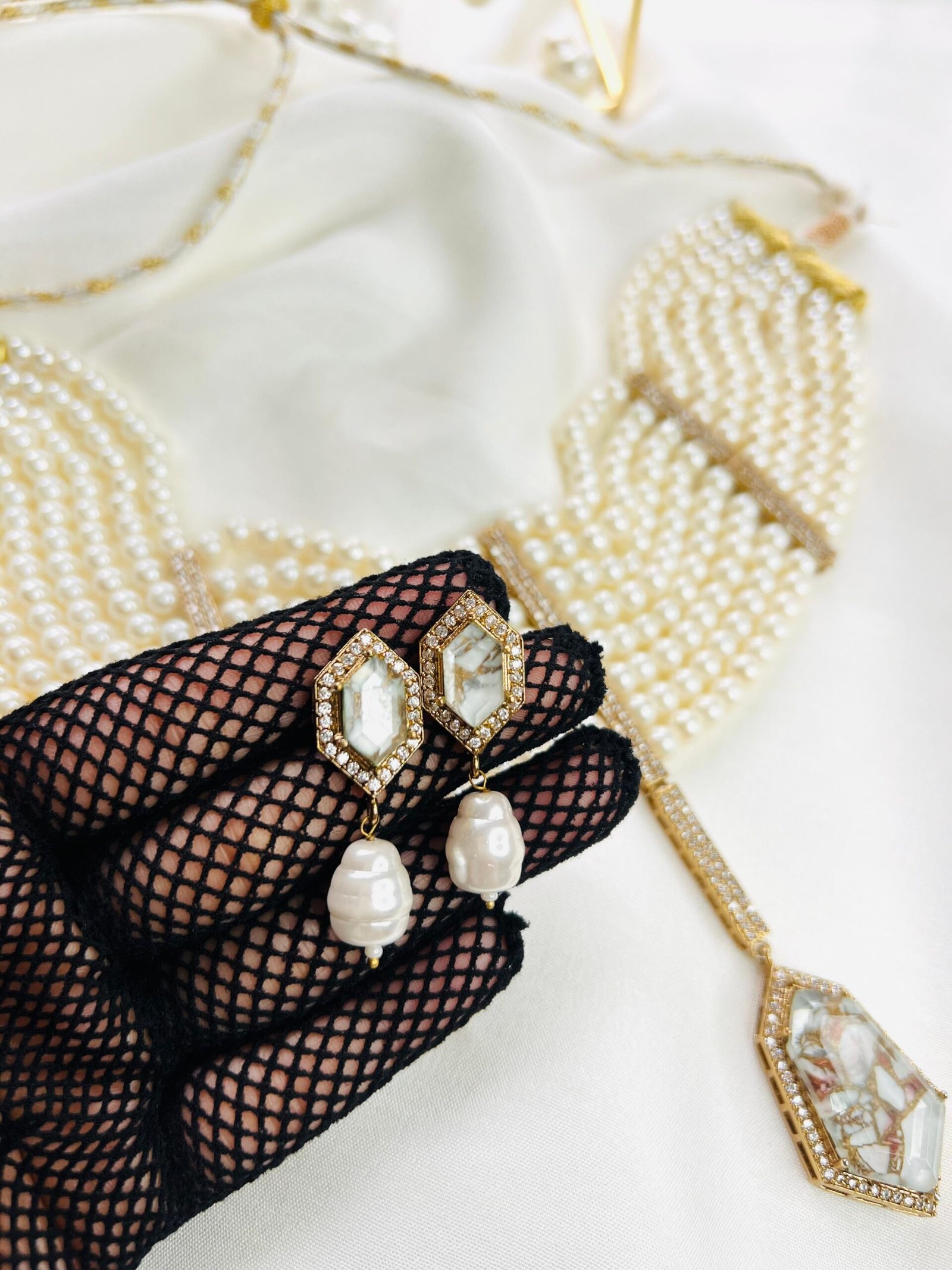 A regal pearl set featuring a frosted marble-effect gemstone pendant framed in diamonds, complemented by matching drop earrings with baroque pearls — the epitome of elegance and grace.