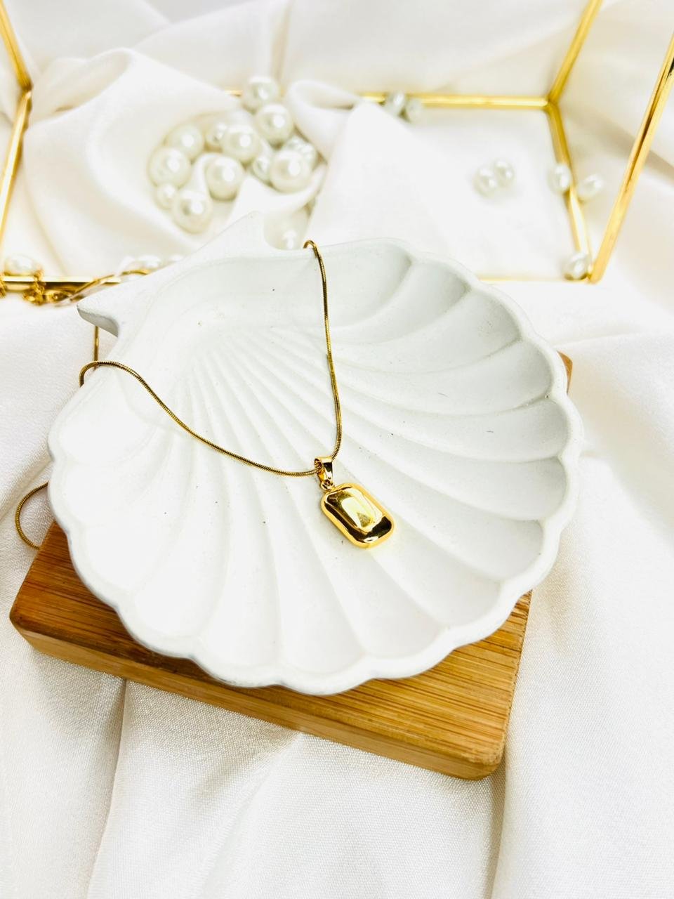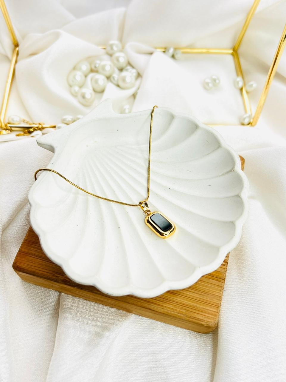 A sleek gold-tone chain paired with a bold rectangular black stone pendant. Clean lines and a modern finish make it perfect for a sharp, minimal statement—day or night.