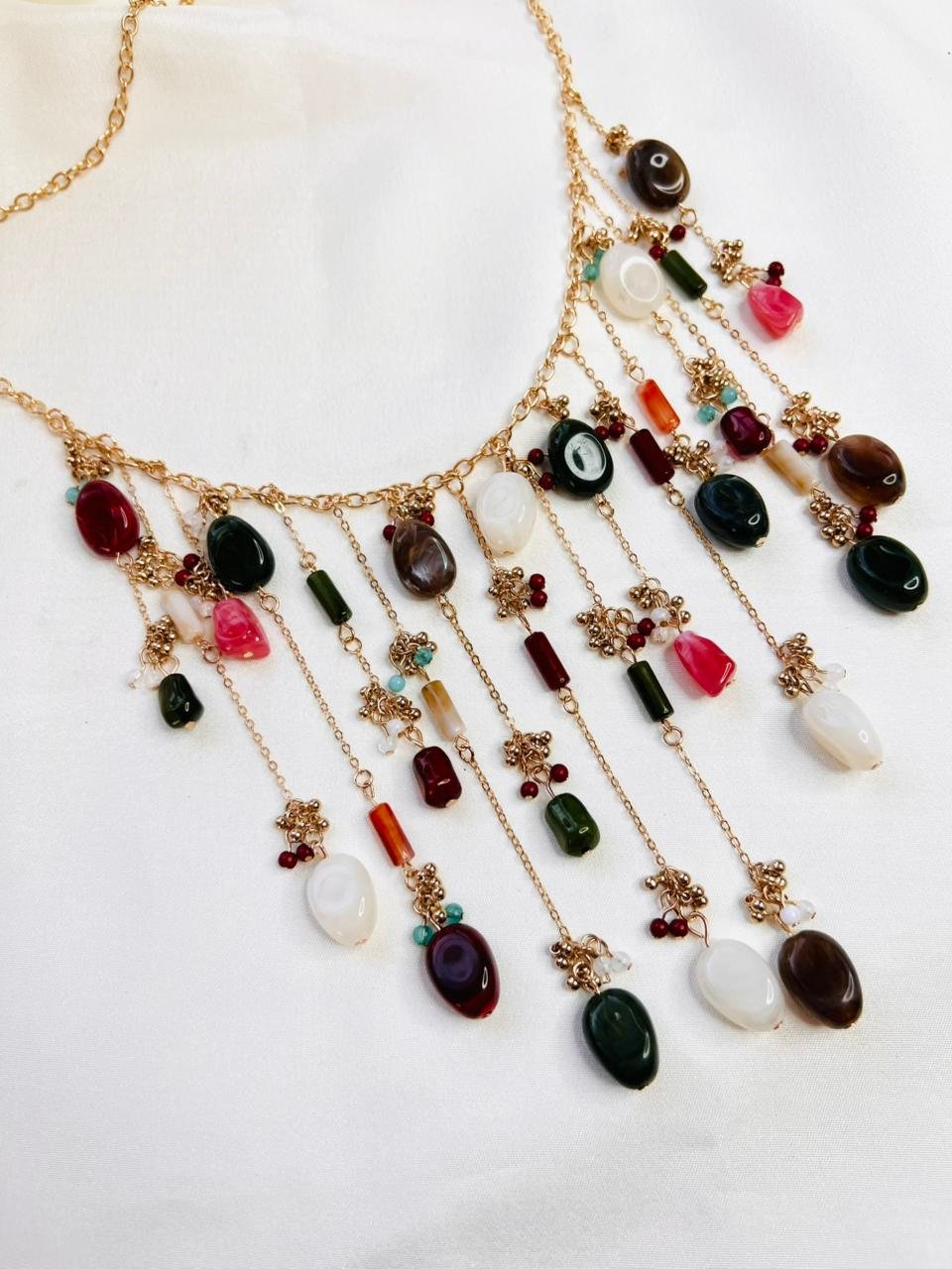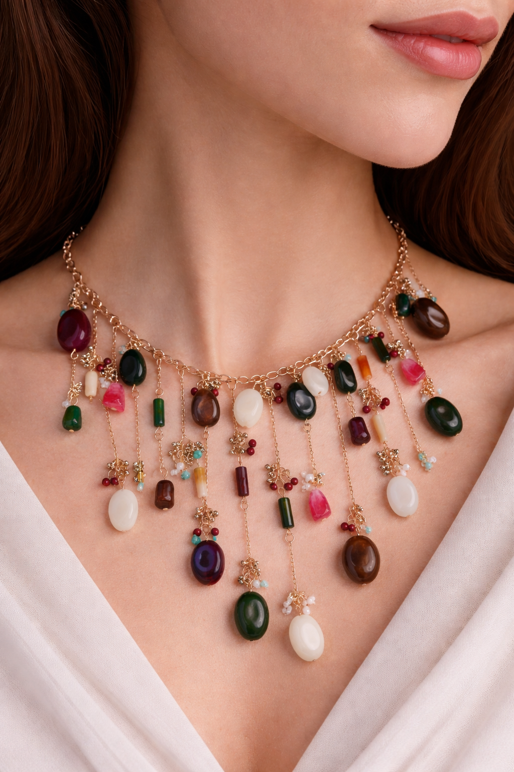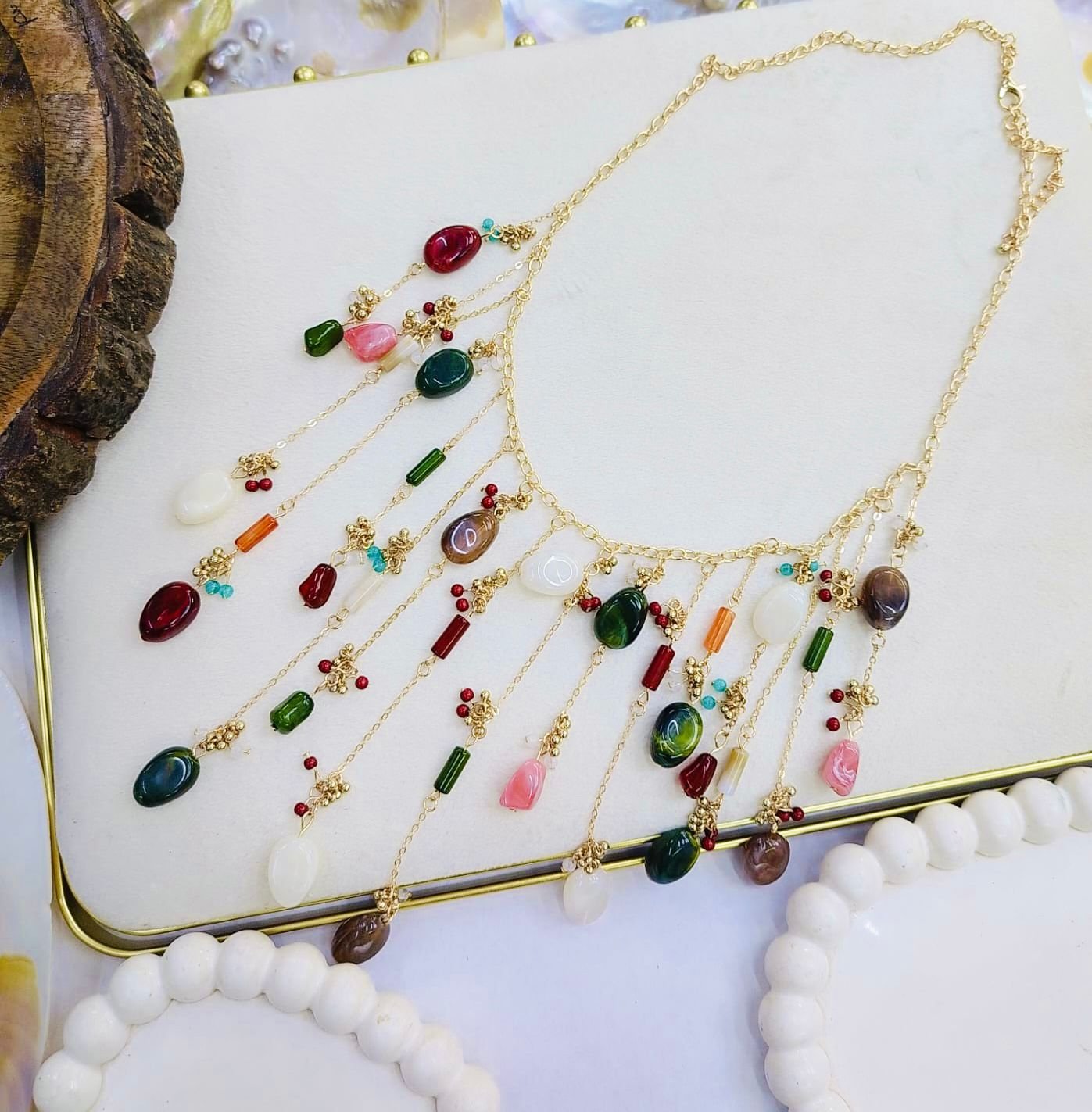 A stunning blend of multicolor stones delicately draped on fine gold-toned chains, the Rainbow Cascade Charm Necklace brings a playful yet elegant touch to any look. Perfect for those who love vibrant, unique, and eye-catching jewelry.