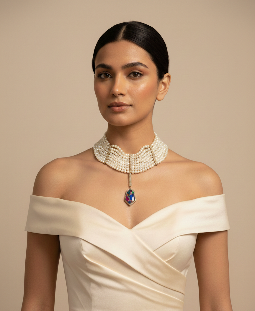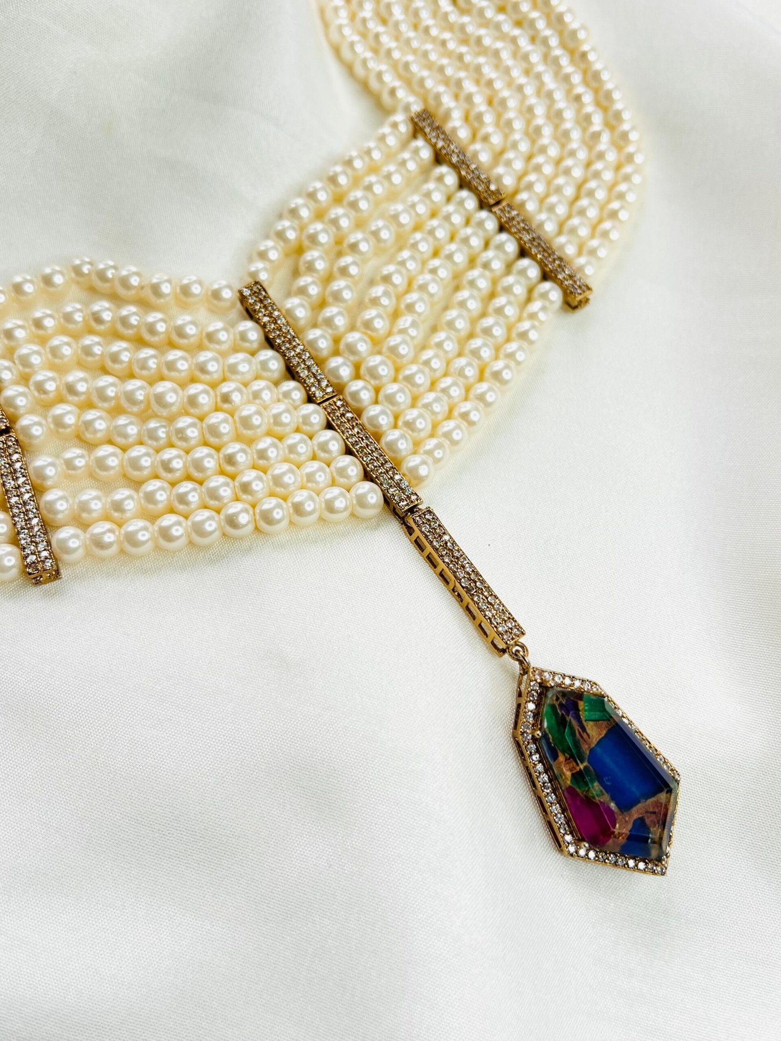 A royal multi-strand pearl set featuring a dazzling prism gemstone pendant with diamond accents, paired with matching mosaic drop earrings adorned with baroque pearls.