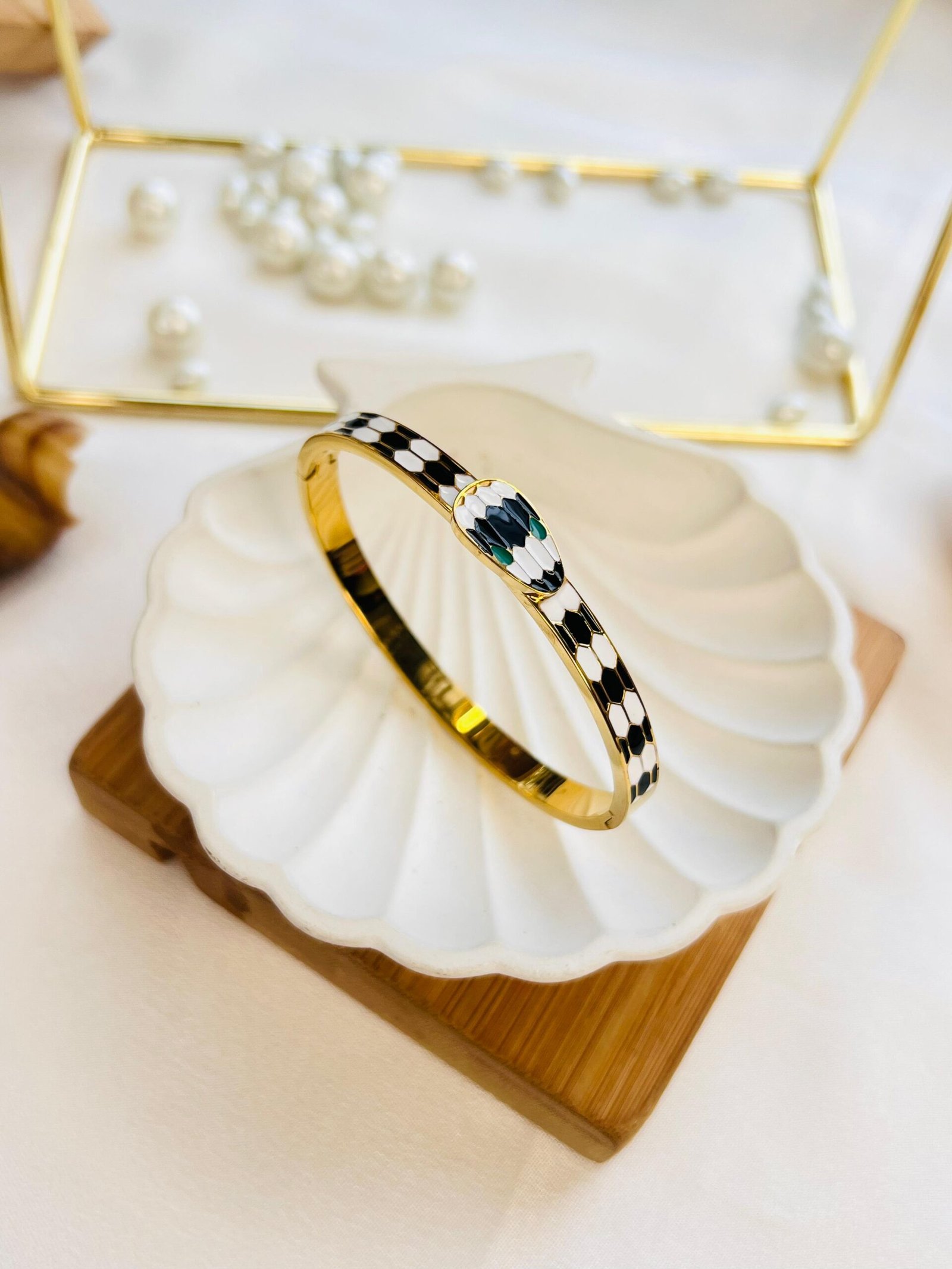 A striking 18K gold-plated cuff with an intricate black, white, and green enamel serpent-scale design, symbolizing power and grace. Anti-tarnish, hypoallergenic, and a bold statement piece.