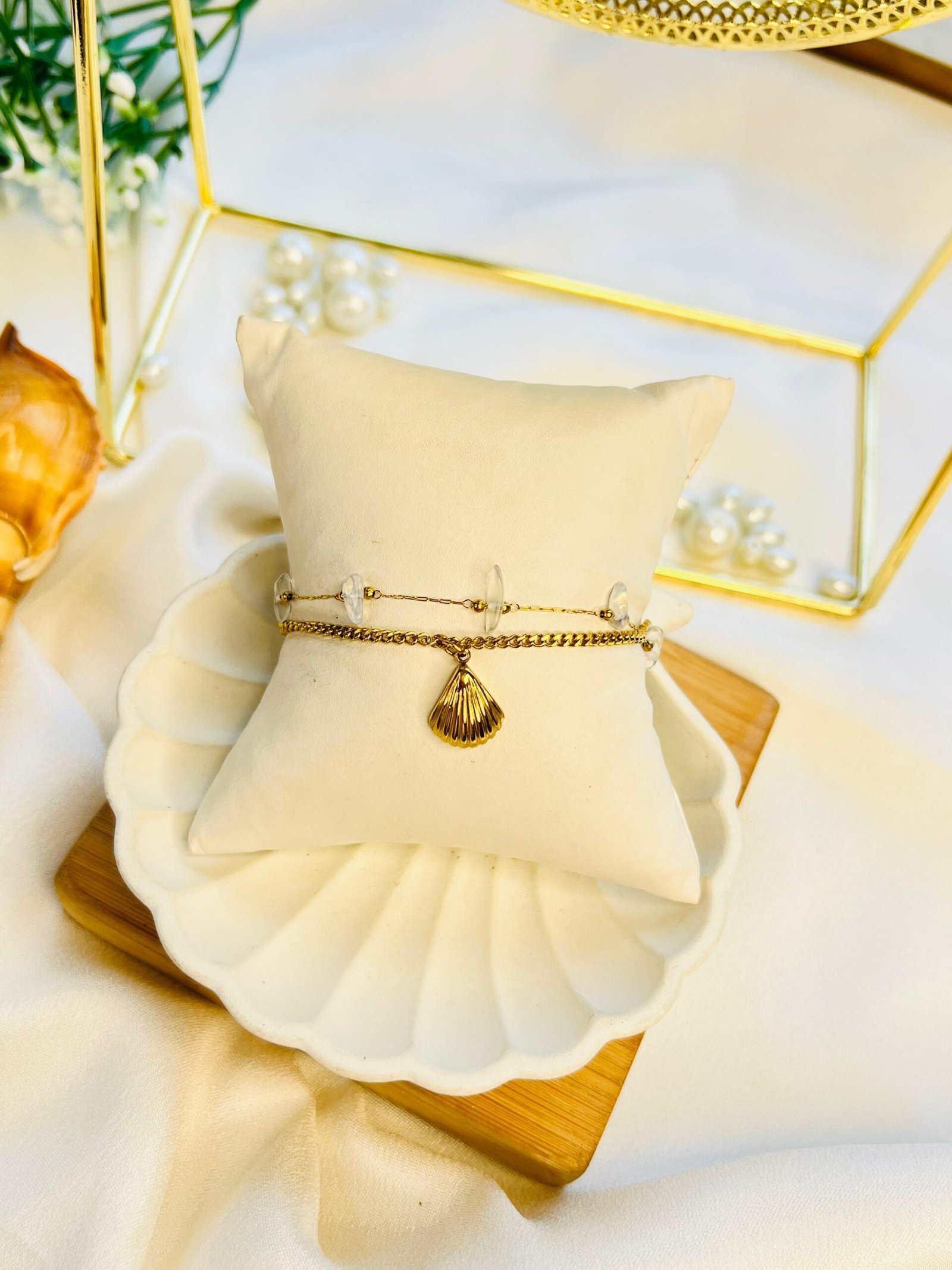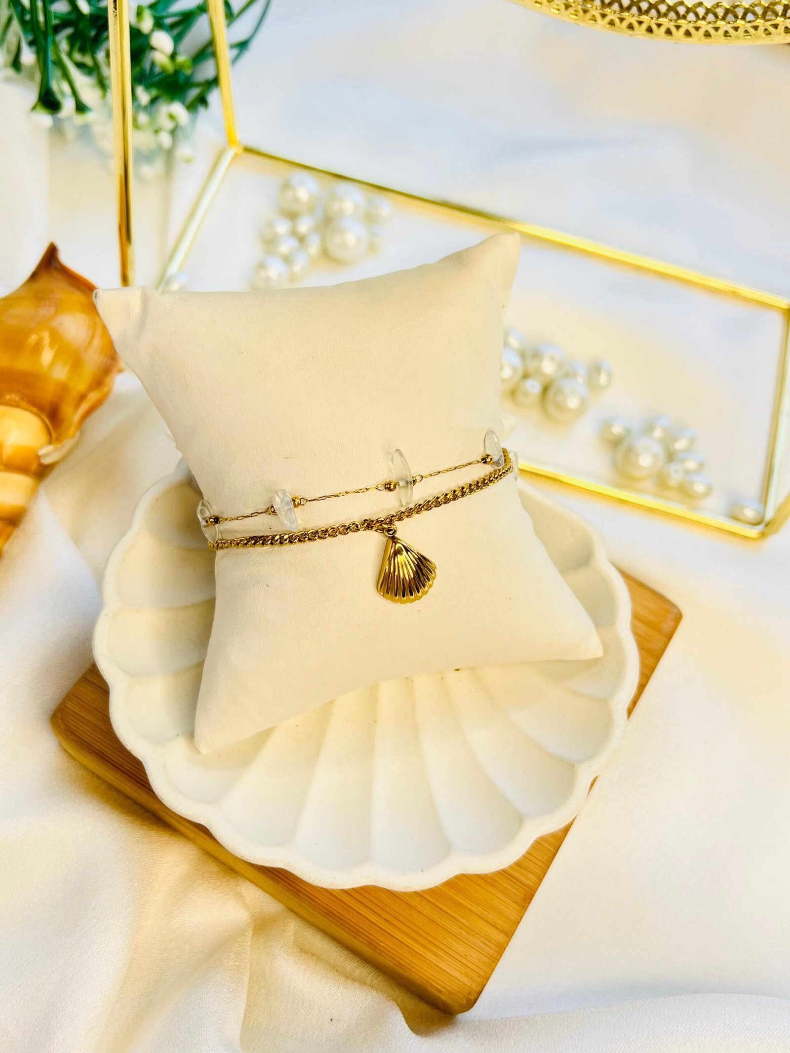 Inspired by the ocean’s hidden gems, the Tide Treasure Bracelet features delicate shell motifs and a radiant gold finish — perfect for beachy souls and sunset chasers.